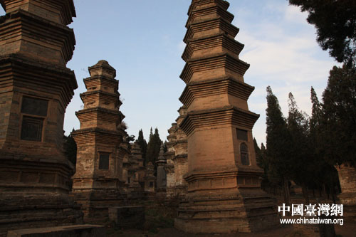 少林寺塔林,位于少林寺西約250米,是少林寺歷代和尚的墳?zāi)。有唐以來歷代古塔230余座,是國內(nèi)最大的塔林,有磚、石和磚石混合結(jié)構(gòu)的各類墓塔。其中,唐塔2座、宋塔2座。金塔10座、元塔46座、明塔148座、現(xiàn)代和尚墓塔2座,余為清塔或時代不詳者。有單層單檐塔、單層密檐塔、印度窣堵坡塔和各式喇嘛塔等。有正方形、長方形、六角形、八角形、圓形等,式樣繁多,造型各異,是綜合研究我國古代磚石建筑和雕刻藝術(shù)的寶庫。(中國臺灣網(wǎng) 徐維彬 攝)