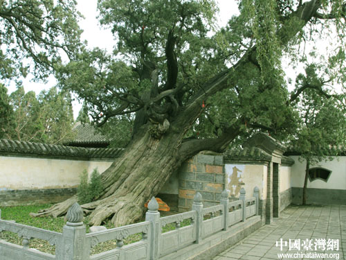 圖為“大將軍柏”。在嵩陽書院的東側(cè),有一侏高大無比的古柏,其樹齡均在4000年以上,是中國現(xiàn)存最古老的柏樹。漢封將軍柏原有三棵,是漢武帝游嵩山時(shí)因見樹高大而封之為大將軍柏,二將軍柏和三將軍柏。三將軍柏清初被火燒毀,現(xiàn)存大將軍柏和二將軍柏。(中國臺灣網(wǎng) 徐維彬 攝)