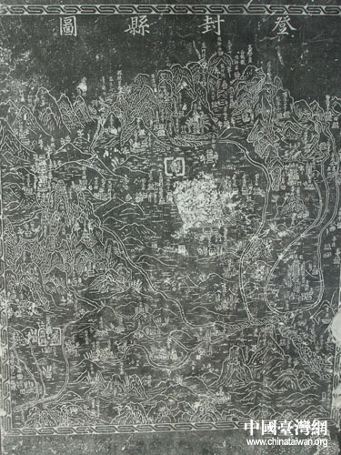 嵩陽書院明代石刻“登封縣地圖”,刻于萬歷癸巳年(公元1593年),圖上詳細(xì)刻制著嵩山地區(qū)名勝古跡的分布情況和山川、河流、道路、村鎮(zhèn)等名稱,是登封文物分布圖,又是登封縣地圖。登封縣文物名勝盡管志書都有記載,但用地圖形式直接描述的,僅此一塊登縣石刻地圖。(中國臺灣網(wǎng) 徐維彬 攝)