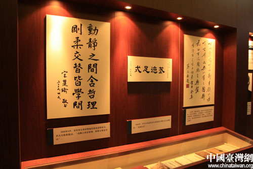 圖為太極拳祖祠展出連戰(zhàn)、宋楚瑜等人的墨寶(中國臺灣網(wǎng) 徐維彬 攝)