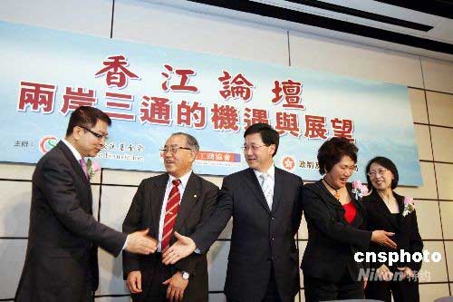 由香江文化交流基金會主辦的“香江論壇---兩岸三通的機遇與展望”,六月二日在香港會展中心舉行。圖為香港政制及內(nèi)地事務(wù)局長林瑞麟(中)與主持人香江文化交流基金會主席江素惠(右二)歡迎與會者。中新社發(fā) 洪少葵 攝