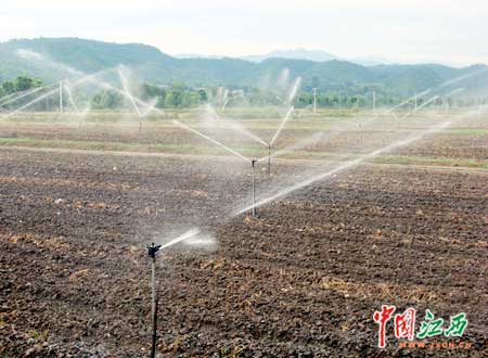 江西金源農(nóng)業(yè)開發(fā)公司先進的有機菜場噴灌系統(tǒng)。(中國江西新聞網(wǎng)記者記者 王凱 攝)