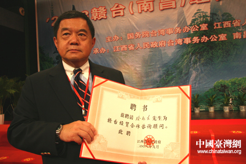 中國(guó)臺(tái)灣網(wǎng)9月22日南昌消息 今日上午,由國(guó)務(wù)院臺(tái)灣事務(wù)辦公室、江西省人民政府主辦的2008贛臺(tái)(南昌)經(jīng)貿(mào)合作研討會(huì)在南昌紅谷灘會(huì)議中心隆重開幕。在開幕式上,馬紹進(jìn)等16名臺(tái)商被聘請(qǐng)為贛臺(tái)經(jīng)貿(mào)合作咨詢顧問。