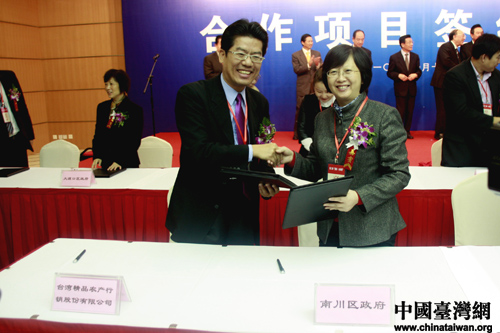 合作項(xiàng)目簽約儀式上渝臺(tái)雙方代表現(xiàn)場(chǎng)簽約。(中國(guó)臺(tái)灣網(wǎng) 程軼文攝)
