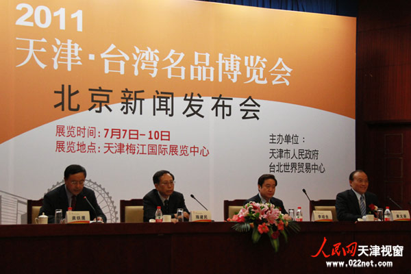 人民網(wǎng)·天津視窗6月14日電:6月13日下午,“2011天津-臺灣名品博覽會”在中國貿(mào)促總會大禮堂召開首次新聞發(fā)布會。從發(fā)布會上獲悉,7月7日至10日“2011天津-臺灣名品博覽會”將在天津梅江會展中心舉行。會上,天津市人民政府副秘書長李培生臺北世界貿(mào)易中心副總經(jīng)理黃文榮分別代表主辦單位介紹展會特色及最新展覽訊息。此外,現(xiàn)場還提前展示了多項亮點產(chǎn)品。