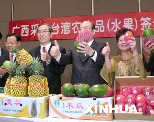 廣西采購臺灣農(nóng)產(chǎn)品(水果)簽約儀式25日在臺南舉行。廣西向臺南縣玉井鄉(xiāng)農(nóng)會購買鳳梨(菠蘿)、芭樂(番石榴)和木瓜三個品種共150多噸,采購金額超過1000萬元新臺幣。