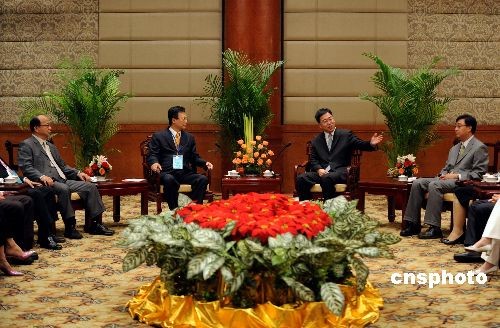 6月26日,國家旅游局副局長杜江在北京國際飯店會見臺灣中部四縣市負責人,臺中市市長胡志強、彰化縣縣長卓伯源、臺中縣縣長黃仲生、南投縣農(nóng)業(yè)處處長陳朝旺。 中新社發(fā) 廖攀 攝