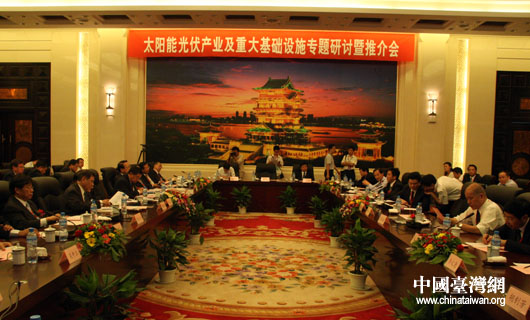 9月21日上午,由國務院臺辦和江西省政府共同主辦的“2009贛臺經(jīng)貿(mào)合作研討會”在南昌開幕。開幕后,兩岸工商企業(yè)代表就有關(guān)投資合作項目及協(xié)議現(xiàn)場簽約,隨后,江西省七個專題的研討暨項目推介會同時展開。圖為太陽能光伏產(chǎn)業(yè)及重大基礎設施專題研討會暨推薦會現(xiàn)場。(中國臺灣網(wǎng) 鐘寶華 攝)