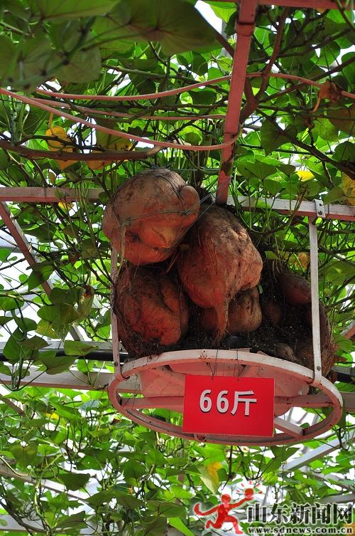 “地瓜怎么長在空中!”在蔬菜示范園7號(hào)展廳,猛然聽到前面?zhèn)鱽眢@呼聲。抬頭一看,可不是嗎,頭頂是一墩墩的地瓜,有一墩標(biāo)著重量,達(dá)33公斤。五指茄、凱越黃瓜、巨人南瓜、斯馬特、辣椒樹、魚菜共生、家庭植物工廠一系列蔬菜品種讓記者們看得眼花繚亂、大開眼界。
