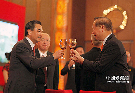 5月8日晚,中共中央臺灣工作辦公室為第七屆兩岸經(jīng)貿(mào)文化論壇舉行歡送晚宴。圖為王毅與參加論壇的臺灣嘉賓舉杯同慶論壇取得圓滿成功!。ㄖ袊_灣網(wǎng) 田云鵬 攝)