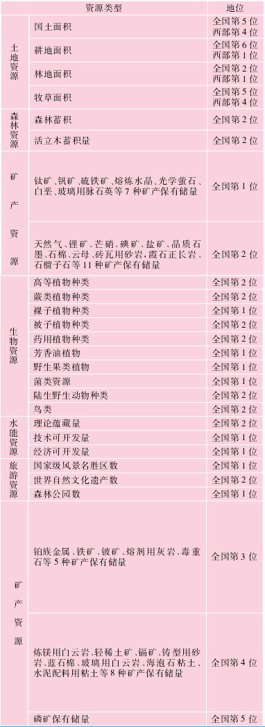 四川省礦產(chǎn)資源豐富且種類比較齊全,能源、黑色、有色、稀有、貴金屬、化工、建材等礦產(chǎn)均有分布。已發(fā)現(xiàn)各種金屬、非金屬礦產(chǎn)132種,占全國總數(shù)的70%;已探明一定儲量的有94種,占全國總數(shù)的60%,分布在全省大部分地區(qū)。有32種礦產(chǎn)保有儲量居全國前5位,其中鈦礦、釩礦、硫鐵礦等7種礦產(chǎn)居全國第一位。釩、鈦具有世界意義,鈦儲量占世界總儲量的82%,釩儲量占世界總儲量的1/3;天然氣、鋰礦、芒硝等11種礦產(chǎn)居全國第二位;鉑族金屬、鐵礦等5種居全國第三位;煉鎂用白云巖、輕稀土礦等8種礦產(chǎn)居全國第四位;磷礦居全國第五位。
