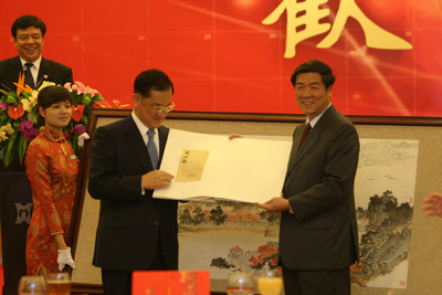 會(huì)后,連戰(zhàn)與廈門市政府相互交換禮物,廈門市政府并設(shè)宴款待臺灣貴賓。(謝曉萍 徐麗麟)