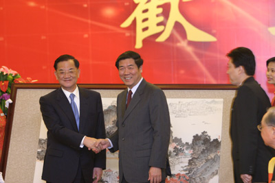 廈門市政府贈(zèng)送連戰(zhàn)禮物后,雙方握手