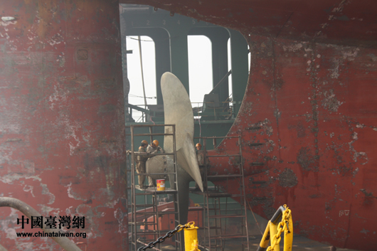 正在中遠(yuǎn)川崎維護的南通號15萬噸級巨輪。圖為巨輪螺旋槳部分。 (中國臺灣網(wǎng) 王偉 攝)
