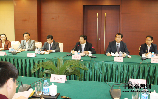 11月4日下午,“面向大!獌砂睹襟w江蘇沿海行”聯(lián)合采訪活動(dòng)到達(dá)第一站——連云港。中共連云港市委書記王建華向前來采訪的兩岸媒體記者介紹連云港經(jīng)濟(jì)和社會(huì)發(fā)展情況。 (中國臺(tái)灣網(wǎng) 王偉 攝)