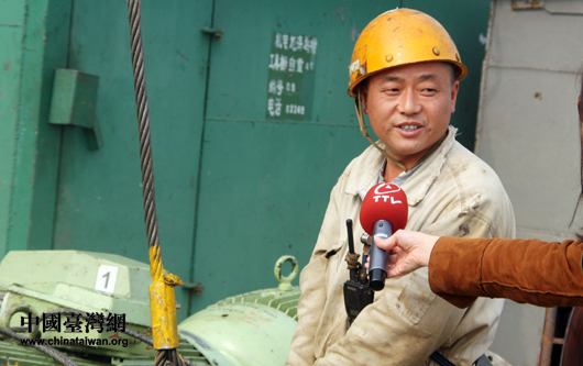 兩岸媒體7日上午參觀了中遠(yuǎn)川崎,圖為公司工人接受臺(tái)視采訪。 (中國(guó)臺(tái)灣網(wǎng) 王偉 攝)