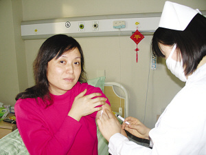 醫(yī)務(wù)人員給韓秀芳打動(dòng)員劑。