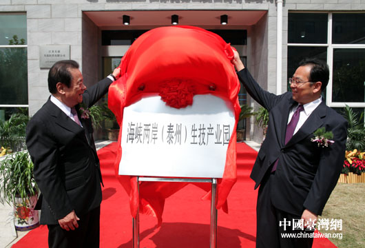 9月19日,在江蘇省泰州市“中國(guó)醫(yī)藥城”內(nèi),臺(tái)灣工業(yè)總會(huì)理事長(zhǎng)陳武雄(左)同泰州市委書記張雷共同為“海峽兩岸(泰州)生技產(chǎn)業(yè)園”開(kāi)園揭牌。(中國(guó)臺(tái)灣網(wǎng) 鐘寶華 攝)