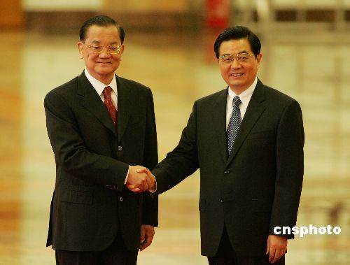 2007年4月28日,中共中央總書記、國家主席胡錦濤在北京人民大會堂會見中國國民黨榮譽主席連戰(zhàn)等出席第三屆兩岸經(jīng)貿(mào)文化論壇的嘉賓,并同全體與會代表一起合影。(中新社)