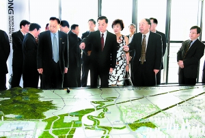 西永微電子園毗鄰重慶大學(xué)城,人才優(yōu)勢與高科技產(chǎn)業(yè)有機(jī)結(jié)合,吸引了大量集成電路、軟件服務(wù)等項(xiàng)目入駐。在西永微電子產(chǎn)業(yè)園區(qū)開發(fā)有限公司,連戰(zhàn)先生一行駐足在沙盤前,饒有興致地聽取黃奇帆的情況介紹。