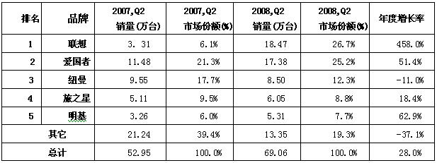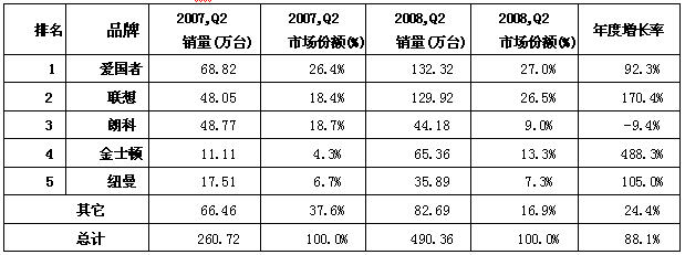 2008年Q2,愛國者依然占據(jù)市場第一的寶座,銷售量為132.32萬臺,占據(jù)27.0%的市場份額;而聯(lián)想不甘落后,通過推出聯(lián)想福娃、奧運(yùn)火炬等閃存盤,跳脫出傳統(tǒng)的降價(jià)促銷,大手筆地拉開奧運(yùn)促銷大幕,占據(jù)26.5%的市場份額,二者差距越來越小。