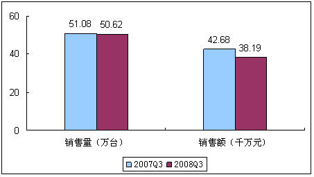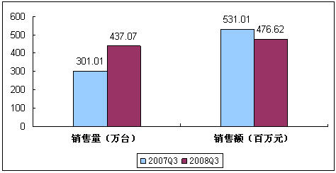 賽迪顧問市場監(jiān)測數(shù)據(jù)顯示,2008年第三季度中國移動(dòng)硬盤市場表現(xiàn)不盡人意,量額齊跌,實(shí)現(xiàn)總銷量50.62萬臺(tái),與2007年同期相比下降0.9%;實(shí)現(xiàn)銷售額3.82億元,同比下降10.5%。