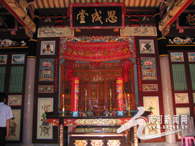 連氏宗祠分為天井、思成堂和中堂,是一座二進(jìn)式的建筑。思成堂祖龕內(nèi)供奉上祖連南夫、馬崎始祖佛保公及夫人等先祖神位。高懸堂中的“翰林”牌匾與祠堂門前的古代樹旗臺(tái),訴說著連氏家族歷史上曾經(jīng)的顯赫與輝煌,也見證了連戰(zhàn)祖輩遷徙的歷史。
