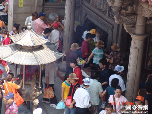 閩臺兩地地理相近、血緣相親。據(jù)悉,目前臺灣有媽祖信眾逾千萬,許多臺灣信眾把到湄洲媽祖進(jìn)香朝拜作為畢生最大的愿望。媽祖是海上的平安女神,每逢三月二十三和九月初九媽祖節(jié)慶,媽祖信眾焚香朝拜,尋根謁祖,成為一道壯麗的人文景觀。十多年來,有五百多批、共一萬余人的臺胞尋根團(tuán)前來尋根謁祖,兩岸舉辦的大型媽祖文化雙向?qū)W術(shù)交流活動也多達(dá)數(shù)十次。而當(dāng)我們參觀的時候,正好有一行臺灣信徒前來進(jìn)香,虔誠的態(tài)度令在場的記者非常感動。據(jù)悉,今年9月24日起約7000名臺灣信徒將到湄洲媽祖廟進(jìn)香,規(guī)模之大將為歷年之最。