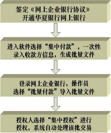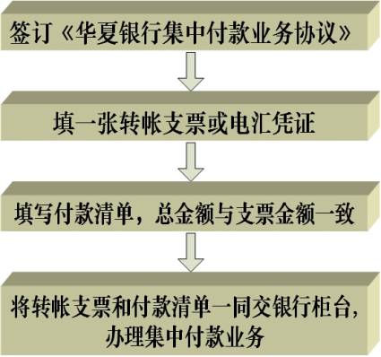 集中付款業(yè)務(wù)是指付款人在需要向多個收款人支付貨款時,依據(jù)與我行簽訂的《華夏銀行集中付款業(yè)務(wù)合作協(xié)議》,向我行提交一張支票(或電匯憑證)和與匯款內(nèi)容對應(yīng)的支付清單,同時完成向多個收款人支付款項的結(jié)算業(yè)務(wù)。付款人也可以使用"華夏互連通"集中付款軟件錄入支付信息,通過華夏銀行網(wǎng)上企業(yè)銀行一次性向多家收款人進行支付。