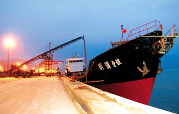 | 正在連夜裝砂的貨輪