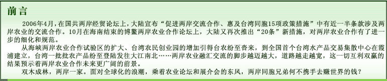 鼓勵(lì)兩岸農(nóng)業(yè)合作與技術(shù)推廣,大陸有關(guān)部門(mén)將運(yùn)用農(nóng)業(yè)技術(shù)推廣資金予以支持。 |