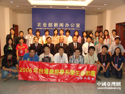 中國(guó)臺(tái)灣網(wǎng)6月28日消息 昨天下午,臺(tái)灣青年學(xué)生大陸訪問團(tuán)一行33人應(yīng)邀來農(nóng)業(yè)部參觀訪問。參觀訪問團(tuán)成員都是在島內(nèi)大學(xué)學(xué)習(xí)獸醫(yī)、畜牧和農(nóng)經(jīng)等專業(yè)的學(xué)生,大陸海峽兩岸農(nóng)業(yè)交流協(xié)會(huì)特別邀請(qǐng)農(nóng)業(yè)部相關(guān)司局的負(fù)責(zé)人、青年干部與臺(tái)灣學(xué)生進(jìn)行了交流,進(jìn)一步增進(jìn)臺(tái)灣學(xué)生對(duì)大陸農(nóng)業(yè)農(nóng)村發(fā)展的認(rèn)識(shí)、了解,從而推動(dòng)兩岸農(nóng)業(yè)交流與合作的長(zhǎng)遠(yuǎn)發(fā)展。