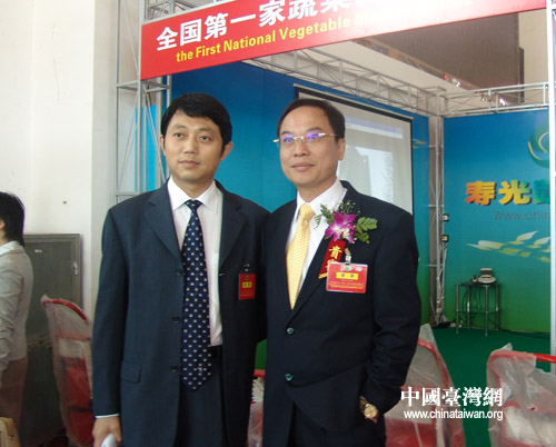 海峽兩岸農(nóng)業(yè)交流協(xié)會副主任李永華(左)與臺灣省農(nóng)會總干事張永成(右)在會展現(xiàn)場