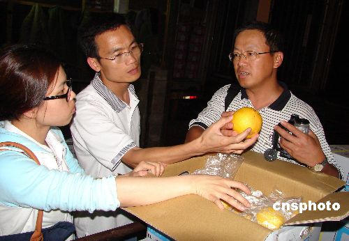 6月6日晚,第一批從臺(tái)灣運(yùn)來(lái)泉州參展的30噸水果抵達(dá)泉州,共有臺(tái)灣鳳梨、楊桃、芒果、木瓜、哈密瓜、葡萄柚等10種時(shí)鮮水果。屆時(shí)這些水果將運(yùn)往南安石井閩臺(tái)農(nóng)產(chǎn)品市場(chǎng),參加8日至12日舉行的第三屆海峽兩岸(泉州)農(nóng)業(yè)合作交流洽談會(huì)暨首屆海峽兩岸(泉州)農(nóng)產(chǎn)品展洽會(huì)。圖為臺(tái)灣參展商在檢查剛運(yùn)抵的葡萄柚。 中新社發(fā) 傅丹丹 攝