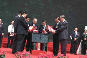 張克輝、韓寓群、李炳才、孫守璞、張敏、江丙坤、張傳林共同將取自海峽兩岸,象征繁榮、合作、共贏之水,注入聚財(cái)寶鼎,為2006海峽兩岸制造業(yè)博覽會(huì)開(kāi)館