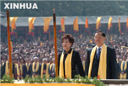 4月19日,中國國民黨榮譽主席連戰(zhàn)及夫人在河南新鄭市參加丁亥年黃帝故里拜祖大典。 新華社記者 趙鵬攝