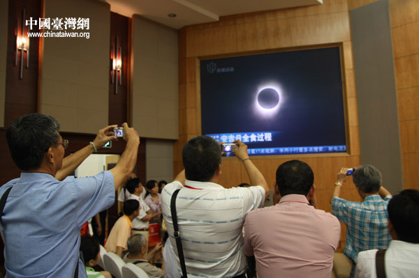 兩岸鄉(xiāng)村代表22日上午在上海青浦會議中心觀看500年一遇的日全食景觀。(中國臺灣網(wǎng) 邵磌 攝)