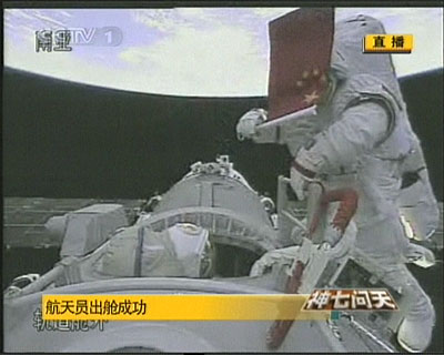 臺(tái)灣東森新聞報(bào)道說(shuō),神舟七號(hào)航天員翟志剛于下午順利在太空中邁出第一步。穿著大陸研發(fā)制造,總重120公斤,造價(jià)3000萬(wàn)人民幣宇宙飛行服的他,以頭先腳后的方式進(jìn)入太空,白色宇宙飛行服上鮮艷的五星紅旗顯得格外醒目。
