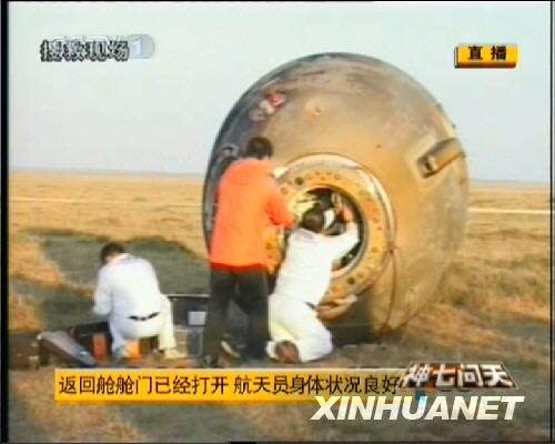 9月28日,神七返回艙艙門打開。 新華社發(fā)(電視截圖)