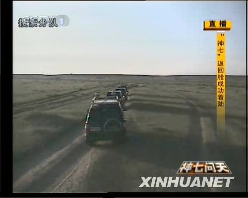 9月28日,神七返回艙成功著陸。這是搜救車隊(duì)正趕往著陸場(chǎng)。新華社發(fā)(電視截圖)