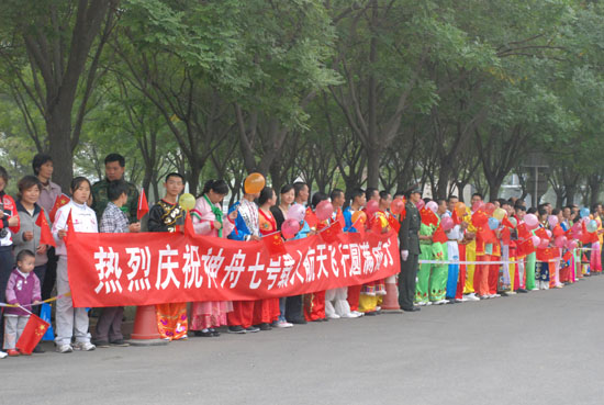 人民網(wǎng)北京9月29日電 北京飛控中心前方報道組報道:執(zhí)行神七載人航天飛行任務的三位航天英雄翟志剛、劉伯明、景海鵬今天上午將回到北京航天城。一大早,沿途已經(jīng)站滿了熱烈歡迎英雄凱旋的群眾。