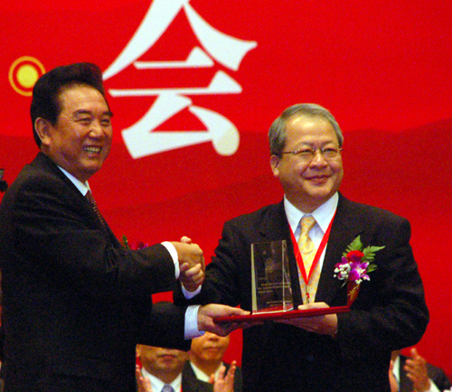 國臺辦主任陳云林為臺企聯(lián)理事丁鯤華頒發(fā)證書