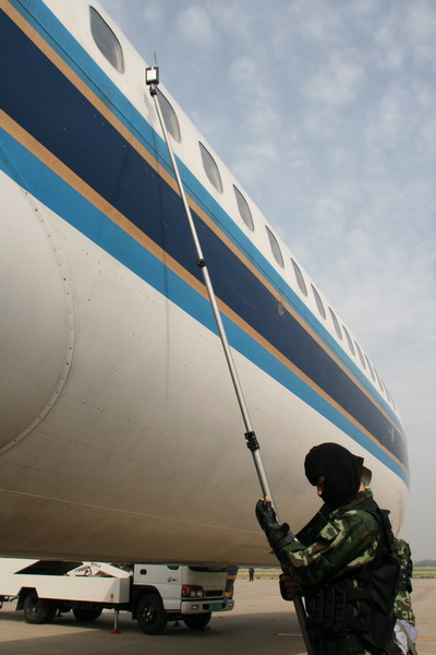 8時(shí)55分,武警反恐大隊(duì)抵達(dá)現(xiàn)場,隨即投入了反劫機(jī)戰(zhàn)斗。偵察組攜帶先進(jìn)的電子聽音器、窺視鏡等,率先從機(jī)尾進(jìn)入飛機(jī)前、后貨艙實(shí)施偵察,很快判明了飛機(jī)上的大致情況。