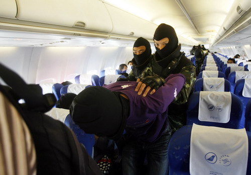 此次演練設(shè)計(jì)的緊急狀況,是某航空公司的2222航班正飛越武漢上空時(shí),突然有兩名不明身份的歹徒用刀脅制四名旅客,并向飛機(jī)駕駛室逼近,企圖劫持飛機(jī)。當(dāng)日上午8時(shí)40分,演練正式開始。