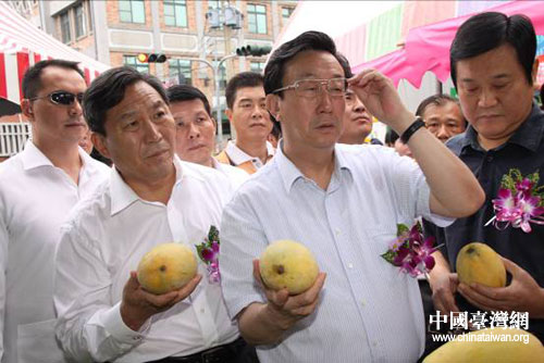 10:30分,郭庚茂一行冒雨參加屏東縣高樹鄉(xiāng)與河南省河洛鎮(zhèn)兩岸友好交流暨農(nóng)產(chǎn)品采購啟運儀式,并宣布農(nóng)產(chǎn)品采購啟運開始。據(jù)介紹,河南省今年將在臺灣分批采購835萬元人民幣的農(nóng)特產(chǎn),此次第一批次采購330萬元人民幣,共1萬2000箱木瓜、菠蘿和芒果。 其余的505萬元人民幣的農(nóng)特產(chǎn)品將分別在7月底及12月底前完成采購任務(wù)。啟動儀式上,高樹鄉(xiāng)長廖文賢與河南省河洛鎮(zhèn)鎮(zhèn)長逯雨林還簽定結(jié)為兄弟聯(lián)誼鄉(xiāng)鎮(zhèn),成為河南與臺灣首家結(jié)隊鄉(xiāng)鎮(zhèn)。