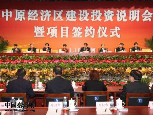 “2011豫臺經(jīng)貿(mào)洽談會暨臺商中原行”之中原經(jīng)濟(jì)區(qū)建設(shè)投資說明會暨項目簽約儀式在河南漯河舉行。(圖片來源:河南省臺辦)
