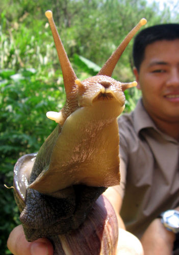 2006年8月26日晚,福州農(nóng)大學(xué)生小廖在回宿舍的路上,發(fā)現(xiàn)一只長達(dá)17厘米,重約300克的巨型蝸牛。后來小廖因?yàn)楹闷姘堰@只大家伙帶回宿舍過了一夜。