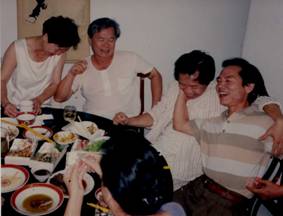 左上:左起大姐、二哥、作者謝雨辰和五弟,酒后笑談童年糗事,樂不可支。 右上:開懷大笑的三哥和作者謝雨辰 左下:離臺前夕,作者妻子的六哥六嫂(中間站里唱歌者)為北京的妹妹和妹夫歡歌送行,攝于臺北盧州家中 右下:(左)大妹與(右)二妹倆人爭著為頻繁應(yīng)酬的四嫂(作者妻子)按摩,舒解疲勞,姑嫂情深