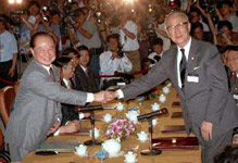 29日上午10點52分,汪道涵、辜振甫分別代表海協(xié)和;鶗凇锻艄紩劰餐瑓f(xié)議》等四項協(xié)議上,鄭重地簽署了自己的名字。對此,辜老先生感慨地表示,“今天上午簽署的協(xié)議,為兩岸事務性交流掀開了新的一頁”,“使兩岸關(guān)系跨出了歷史性的一步”,“為兩岸未來的發(fā)展打下了良好的基礎(chǔ)”,“對發(fā)展兩岸關(guān)系、兩岸交流秩序化將是一座里程碑”。