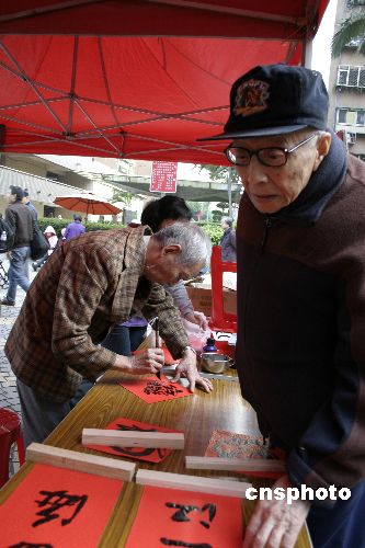 二00七臺(tái)北眷村文化節(jié)開(kāi)幕,老人們?cè)诨顒?dòng)現(xiàn)場(chǎng)書(shū)寫(xiě)對(duì)聯(lián)。 中新社發(fā) 陳國(guó)華 攝